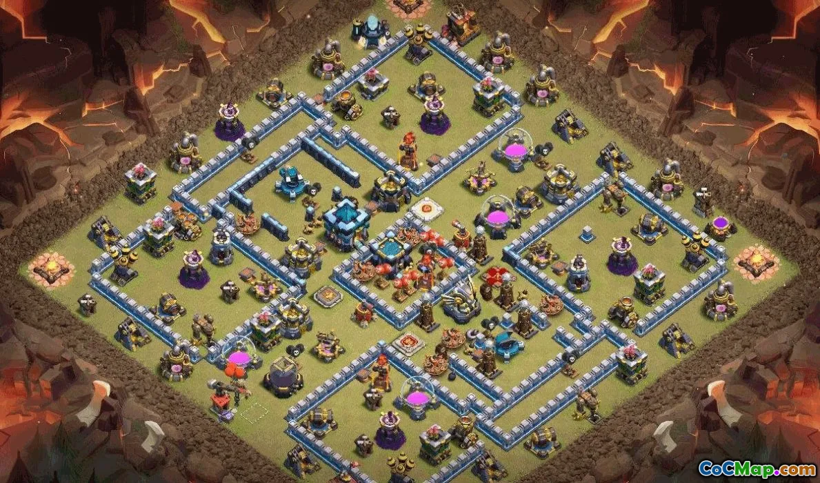 The provided content appears to consist of a base layout template for Clash of Clans, specifically designed for Town Hall 13. This template likely includes different types of layouts such as home village setups, trophy bases, war bases, and map configurations. These layouts are essential for players who want to optimize their defenses, improve their chances in battles, or protect their resources effectively.