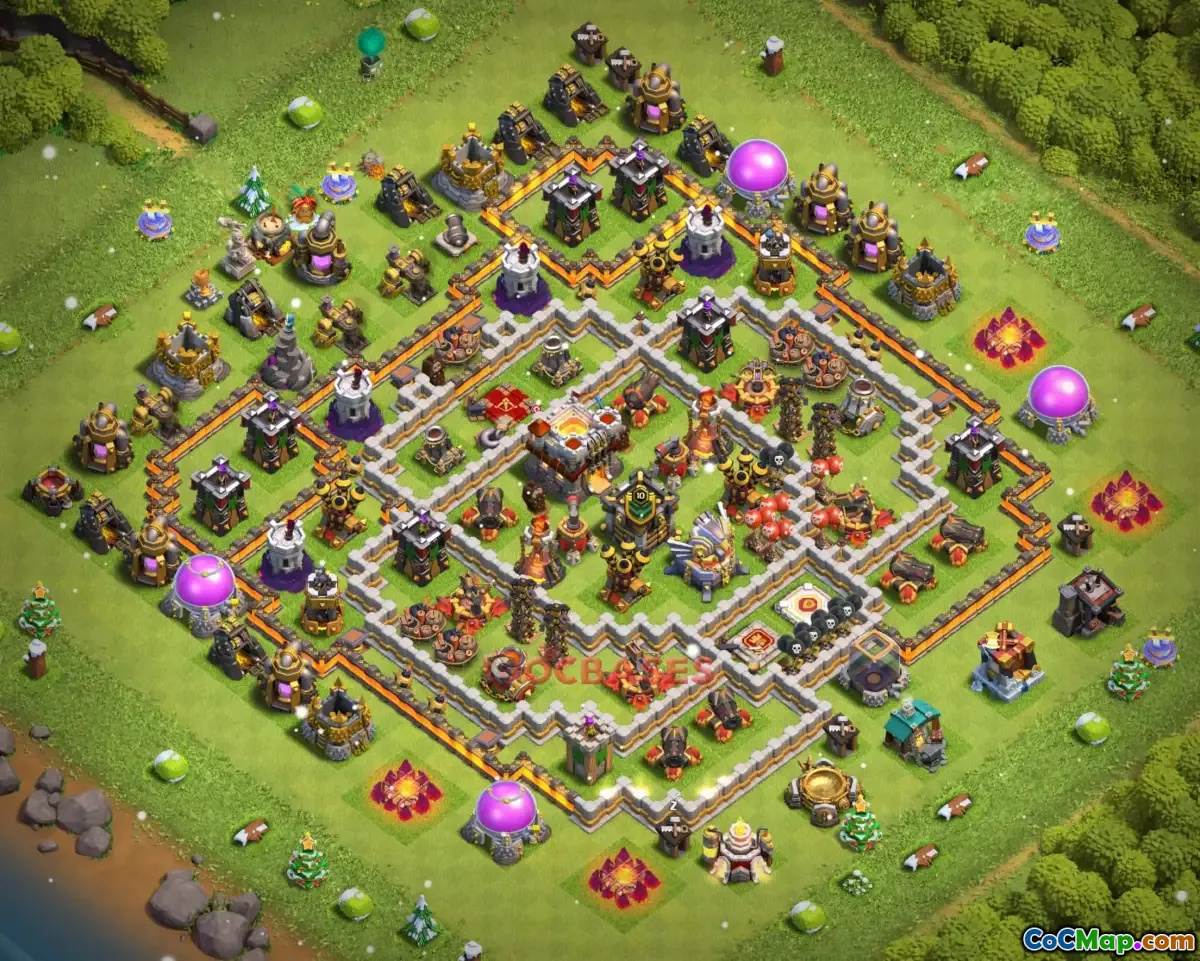 The layout reflects a strategic use of space and resources, ensuring that vital structures, such as the Clan Castle and defenses, are placed in a manner that encourages the enemy to spread their attacks thin. Considerations such as the placement of high-priority buildings and the distribution of traps are key to the effectiveness of this design, allowing for strategic surprises during battles.