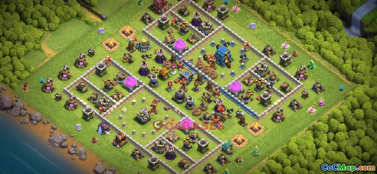 Using a well-structured Town Hall 12 farming base involves placing defenses like Archer Towers, Cannons, and Mortars in positions that cover resource storages and choke points. Additionally, Clan Castle and Hero positions are crucial for defending against attacks, as they can provide additional firepower and distraction for invading troops. Strategic placement of walls further enhances the base’s ability to slow down attackers and protect the resources. Many players also use specific trap placements, such as bombs or spring traps, in common attack pathways to surprise attacking troops.