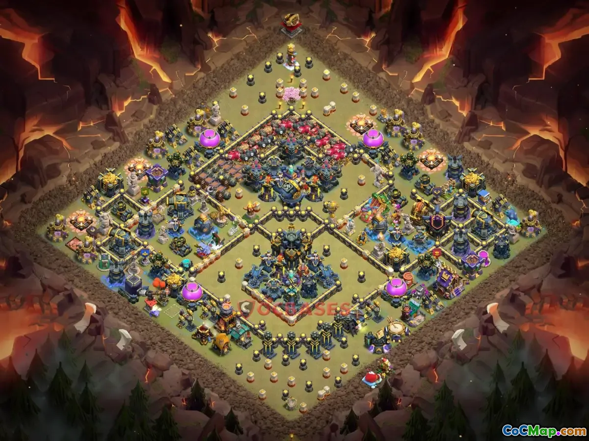 This Town Hall 17 CWL base is designed to enhance defensive performance during Clan War Leagues, offering well-placed defenses and a solid layout to protect key resources and Town Hall. The design aims to confuse attackers and maximize the effectiveness of splash and splash-damage defenses, making it difficult for opponents to breach your defenses effectively.