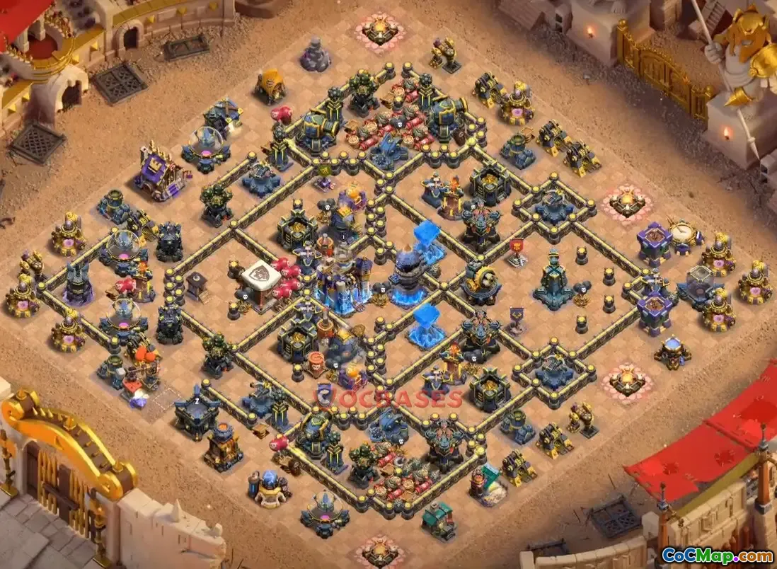 Discover a strategically designed Town Hall 18 war base that maximizes defense and protects key resources. The layout features well-placed defenses, traps, and clan castle positioning to thwart enemy attacks and ensure higher win rates during Clan War battles.