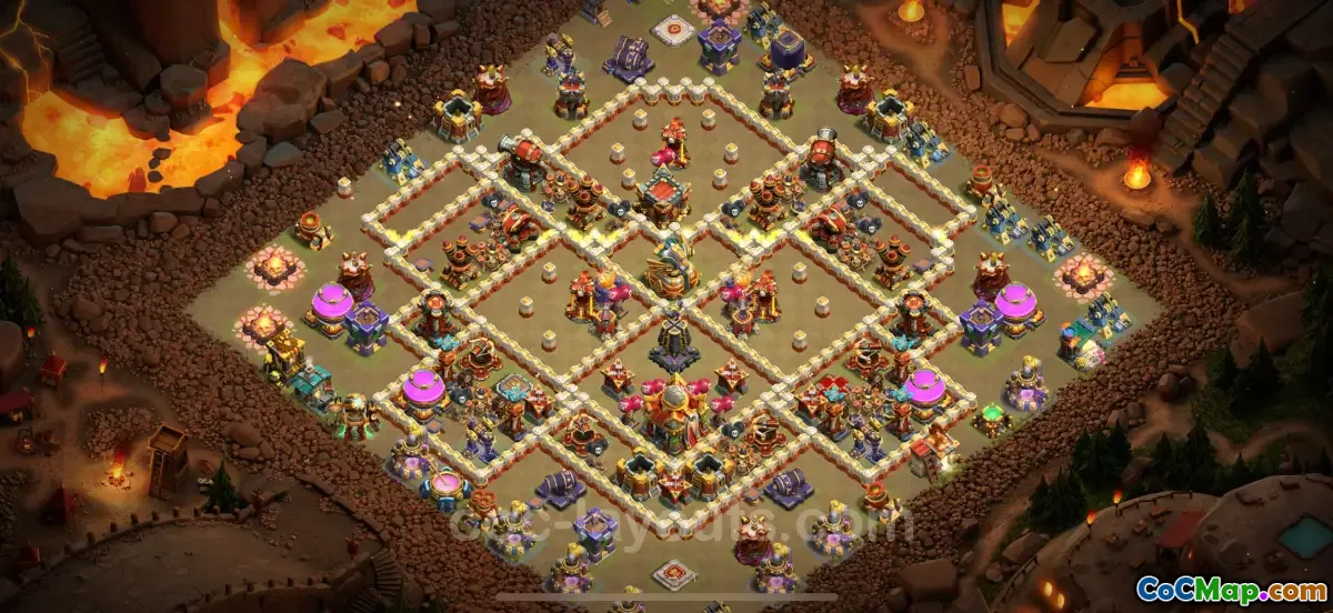 La conception idéale de la base TH16 intègre des défenses anti-tout, ce qui signifie qu'elle est équipée pour contrecarrer divers types d'attaques, y compris les stratégies terrestres, aériennes et hybrides. Cette configuration de base comprend généralement des défenses stratégiquement placées qui couvrent les angles morts tout en garantissant que le cœur de la base est fortifié. La conception de la disposition est destinée à empêcher les attaquants d'accéder facilement à l'hôtel de ville et aux stockages de ressources clés, sécurisant ainsi efficacement les actifs du joueur.