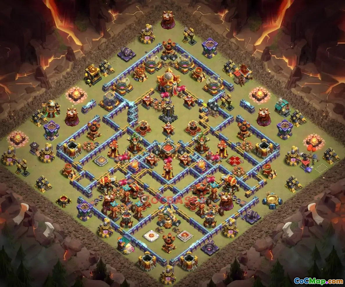 La base de guerre Town Hall 16 intègre généralement diverses structures défensives, stratégiquement positionnées pour créer une défense robuste contre les troupes ennemies. Ces bases sont conçues non seulement pour sauvegarder l'hôtel de ville, mais également pour protéger les ressources clés et les structures améliorées. Les joueurs peuvent trouver différentes configurations et conceptions adaptées à leur style de jeu et aux menaces spécifiques auxquelles ils peuvent être confrontés dans les scénarios de guerre.