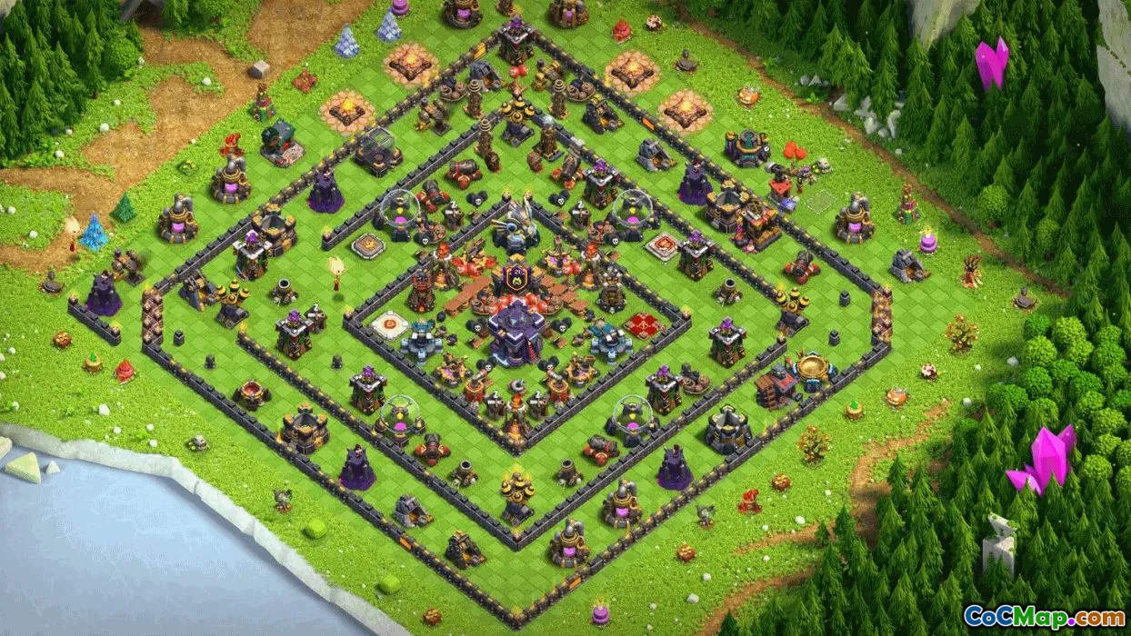 This design emphasizes balance and defense with a layered perimeter, a protected core, and funnel-friendly paths that guide attacking troops toward clustered defenses on the coc map. The home village variant guards resources behind multiple walls, while trophy and war layouts optimize for quick engagements and faster rebuilds after battles. The shared link ensures all copies align on Clan Castle placement and troop deployment routes for consistent defense.