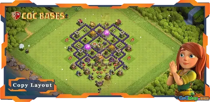 Cette base hybride du niveau 7 de l'Hôtel de Ville est spécialement conçue pour résister aux attaques trois étoiles, ce qui la rend efficace dans les stratégies défensives et de protection des ressources. L'aménagement présente une variété de structures défensives disposées stratégiquement pour sauvegarder l'hôtel de ville tout en protégeant des ressources précieuses. Le placement de ces défenses est essentiel pour garantir que les joueurs adverses auront du mal à remporter une victoire complète contre cette conception de base.