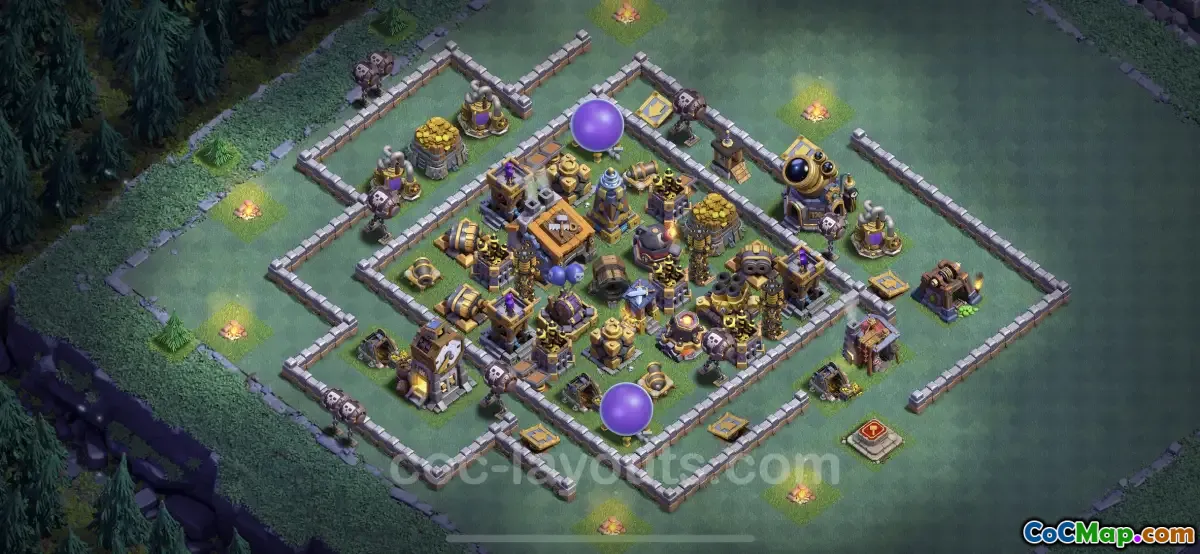 This Builder Hall 9 layout emphasizes strategic placements of defenses and traps, optimizing the base's overall resilience. Key defensive structures, such as the Crusher, Archer Towers, and Cannons, are positioned to cover as much area as possible, creating overlapping fields of fire. Additionally, the layout includes traps that can deceive and damage attackers, further enhancing its anti-everything capabilities.