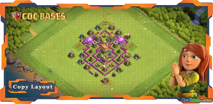 Cette conception de base hybride pour Town Hall 6 (TH6) vise à empêcher les adversaires d'obtenir trois étoiles au combat en créant une disposition stratégique. La principale caractéristique de la conception est l'emplacement central de l'hôtel de ville, qui est crucial pour maintenir le contrôle sur le cœur de la base. Le positionnement stratégique rend difficile pour les attaquants d'atteindre directement l'hôtel de ville, améliorant ainsi la capacité défensive globale du réseau.