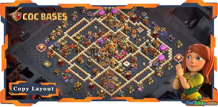 Dans l'ensemble, la configuration de base de l'Hôtel de Ville 16 est bien pensée, l'accent étant mis sur l'optimisation de l'efficacité défensive pour diverses stratégies d'attaque. L'emplacement central de l'hôtel de ville et des défenses environnantes crée une structure semblable à une forteresse capable de résister aux assauts intenses des adversaires, ce qui en fait un choix formidable pour les joueurs dans les scénarios de guerre et de CWL.