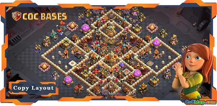 La base de guerre de niveau 16 de l'Hôtel de Ville est conçue pour empêcher l'équipe adverse d'obtenir deux étoiles, en excellant particulièrement contre les troupes aériennes et les Electro Dragons. Son agencement est stratégiquement conçu pour la guerre et les ligues de guerre de clans (CWL), garantissant qu'il peut résister à diverses stratégies d'attaque. La position centrale de l'Hôtel de Ville est un élément clé, car elle augmente sa protection en l'entourant de murs robustes qui dissuadent les attaquants d'y accéder facilement.