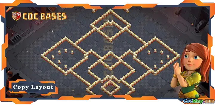 Dans cette base de guerre, l'aménagement intègre une disposition bien pensée des compartiments. En reliant la section centrale de l'hôtel de ville à quatre compartiments adjacents, la conception crée une défense à plusieurs niveaux qui oblige les attaquants à progresser à travers plusieurs niveaux, ce qui rend plus difficile pour eux d'atteindre l'hôtel de ville lui-même. Cette configuration est cruciale dans un contexte de guerre, où une planification et une exécution minutieuses des attaques sont essentielles pour obtenir des étoiles.