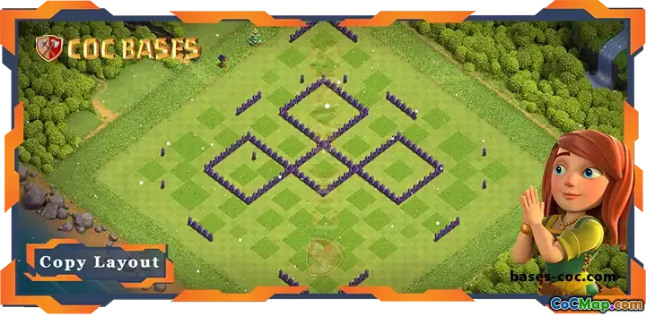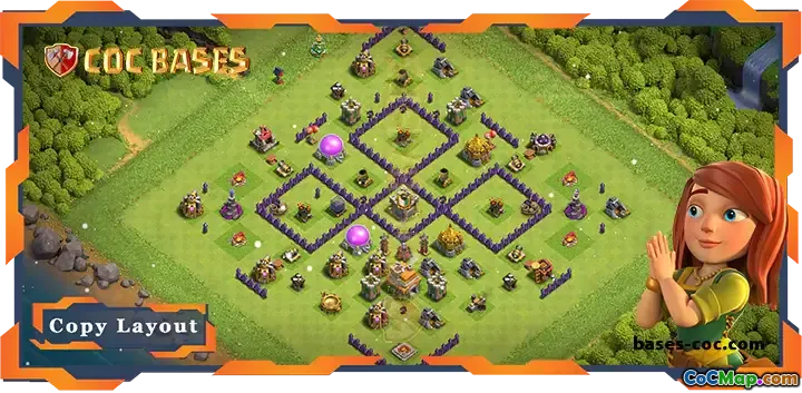 This top TH7 base layout is expertly designed to counter common attack strategies, especially air-based assaults like Air Dragons. Its compact core and strategically placed defenses create a robust barrier, making it difficult for attackers to achieve a three-star victory. The layout incorporates well-positioned air defenses, wizard towers, and splash damage structures to effectively neutralize air troops while defending against ground invasions.