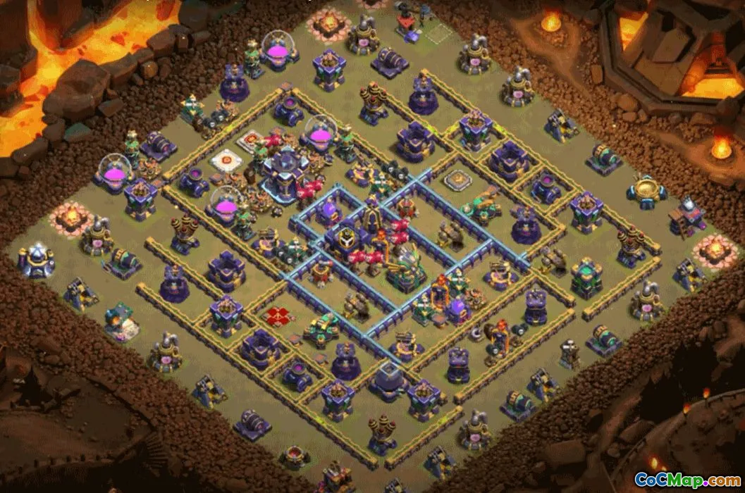The layout works well as a hybrid for home village, trophy base, and war base. Outer storages and resource defenses form a protective moat while traps and small bombs surprise runners. For wars, rotate the core to adjust for enemy attacker patterns and use the coc map layout to maintain optimal coverage across all sides.
