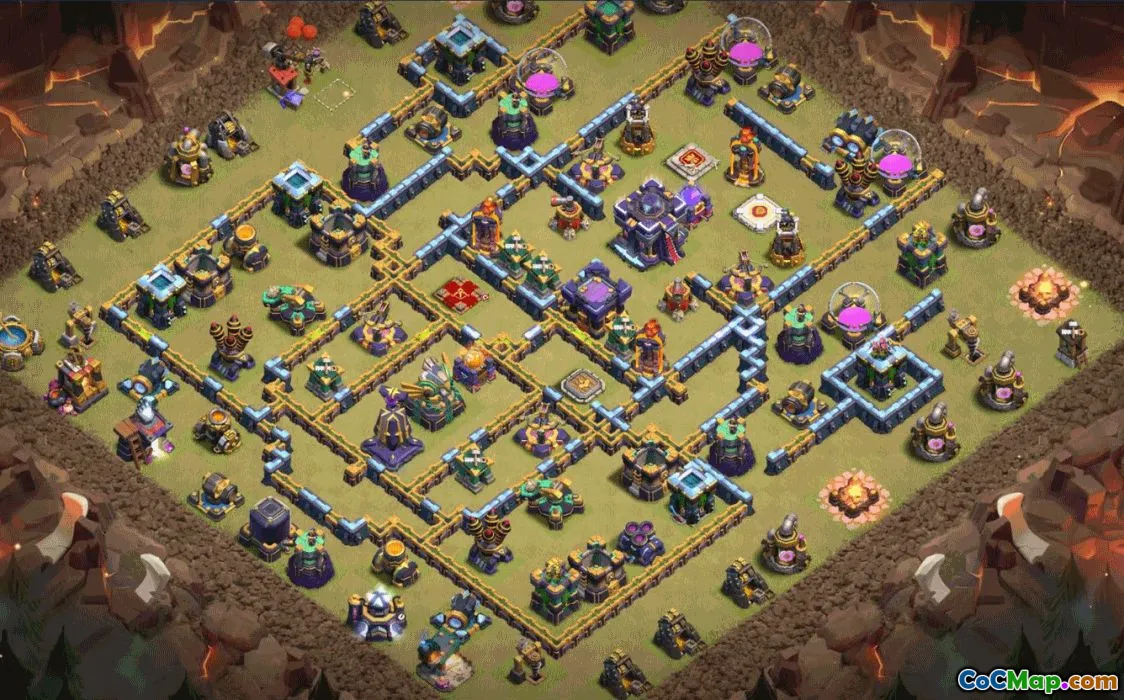 In the home village layout, traps and splash defenses form funnel points guiding enemies toward defenses while protecting resource buildings. The trophy variant prioritizes a durable core and a safer exit path, helping you keep trophies during raids. For War use, a compact core with tuned air and ground coverage keeps stars high; the same core swaps into a rival map for quick adaptation. Copy via the share link, then save and tailor traps to your clan meta.