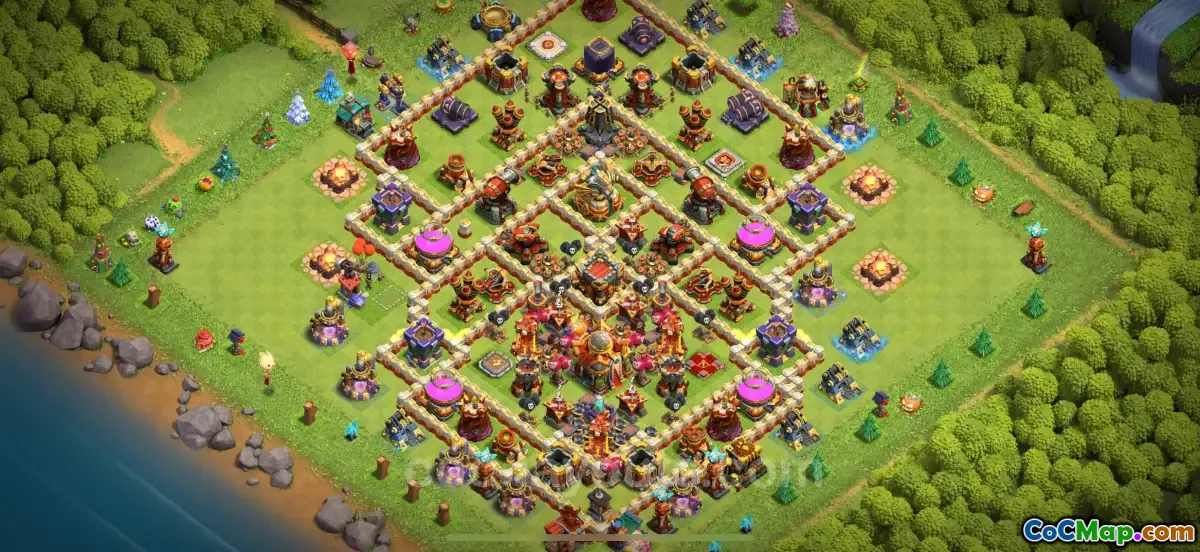 This particular base layout has been crafted with a focus on farming, ensuring that players can safely gather their resources without the constant threat of being raided. The strategic placement of buildings aims to create a strong defense, while also ensuring that important resource storages are adequately protected. The anti 3-star feature is crucial for players who want to maintain their trophies and overall progress without losing significant amounts of resources.