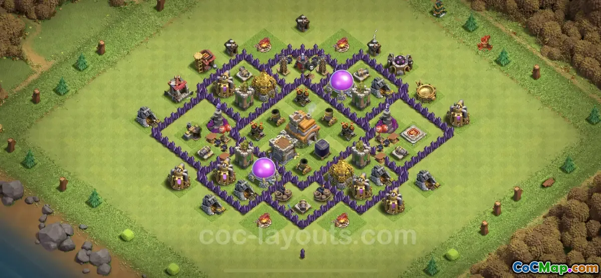 इस TH7 बेस डिज़ाइन में रणनीतिक जाल और बाधाएं भी शामिल हैं, जो विरोधियों को चकमा देने के लिए डिज़ाइन की गई हैं। उदाहरण के लिए, छिपे हुए जाल उन क्षेत्रों में लगाए जा सकते हैं जहां हमलावरों द्वारा अपने सैनिकों को तैनात करने की संभावना होती है, जिससे उन्हें महत्वपूर्ण क्षति होती है या सैनिकों की बर्बादी होती है। इसके अतिरिक्त, लेआउट में अक्सर ऐसे डिब्बे शामिल होते हैं जो बेस के माध्यम से नेविगेट करते समय दुश्मन सैनिकों को धीमा कर सकते हैं, जिससे उनके लिए महत्वपूर्ण रक्षात्मक संरचनाओं तक पहुंचना कठिन हो जाता है।