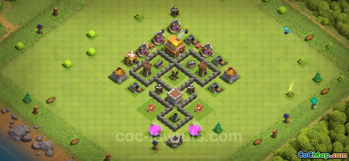 क्लैश ऑफ क्लैन्स में, खिलाड़ियों का लक्ष्य दुर्जेय आधार बनाना है जो दुश्मन के हमलों का सामना कर सकें। टाउन हॉल 4 (टीएच4) के लोगों के लिए, संसाधनों और ट्राफियों की सुरक्षा के लिए अपनी सुरक्षा को मजबूत करना महत्वपूर्ण है। इस स्तर पर उद्देश्य एक आधार लेआउट तैयार करना है जो तीन सितारा हमलों के लिए प्रतिरोधी है, जो तब होता है जब कोई प्रतिद्वंद्वी आधार के सभी प्रमुख तत्वों को सफलतापूर्वक नष्ट कर देता है। सबसे प्रभावी TH4 बेस हमलावरों को चुनौती देने और कमजोरियों को कम करने के लिए डिज़ाइन किए गए हैं।