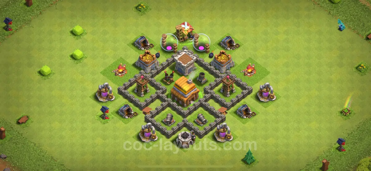 टॉप एंटी एवरीथिंग TH4 बेस विशेष रूप से क्लैश ऑफ क्लैन्स में टाउन हॉल लेवल 4 के खिलाड़ियों के लिए डिज़ाइन किया गया है। इस बेस लेआउट का उद्देश्य विभिन्न प्रकार के हमलों के खिलाफ मजबूत सुरक्षा प्रदान करना, संसाधनों और टाउन हॉल की सुरक्षा करना है। जैसे-जैसे खिलाड़ी खेल के माध्यम से आगे बढ़ते हैं, अलग-अलग रणनीतियों वाले और अलग-अलग सैन्य संरचनाओं का उपयोग करने वाले दोनों हमलावरों के लगातार हमलों का सामना करने के लिए बेस डिज़ाइन को प्राथमिकता देना महत्वपूर्ण हो जाता है।