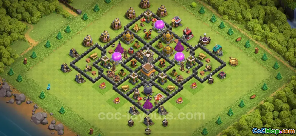 यह उन्नत टाउन हॉल 8 बेस इमारतों और जालों के रणनीतिक संगठन की विशेषता है। तोपों, तीरंदाज़ टावरों और जादूगर टावरों जैसी रक्षात्मक संरचनाओं को प्रभावी ढंग से रखकर, खिलाड़ी सुरक्षा की दुर्जेय परतें बना सकते हैं। व्यवस्था में आम तौर पर विरोधियों को मूल्यवान सामग्रियों को आसानी से लूटने से रोकने के लिए टाउन हॉल को केंद्रीकृत करते हुए इसके चारों ओर संसाधन भंडारण की व्यवस्था करना शामिल है। यह हाइब्रिड लेआउट विशेष रूप से ट्रॉफी खेती और संसाधन छापेमारी हमलों को रोकने में कुशल है।