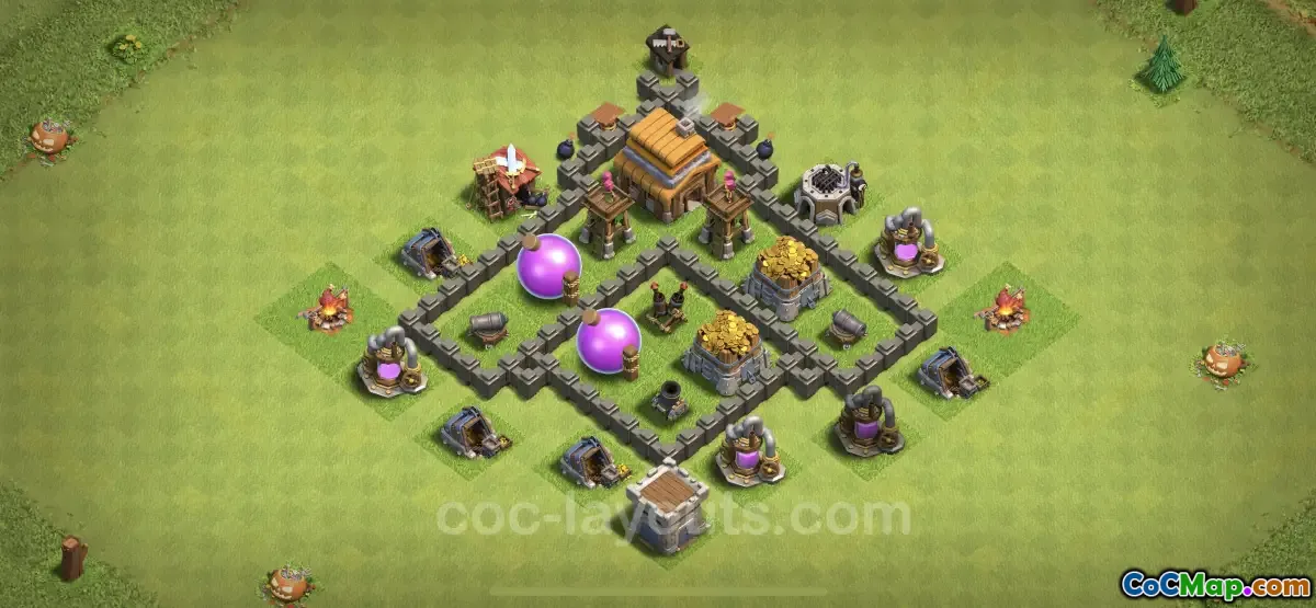 एक अच्छी तरह से डिज़ाइन किया गया TH4 बेस आम तौर पर रक्षात्मक इमारतों का एक संयोजन शामिल करता है, जिसमें तीरंदाज टॉवर, तोपें और वायु रक्षा शामिल हैं। ओवरलैपिंग कवरेज प्रदान करने के लिए लेआउट को इन संरचनाओं को रणनीतिक रूप से स्थित करना चाहिए। वायु रक्षा को केंद्रीय रूप से रखने से बेस के सबसे महत्वपूर्ण हिस्सों की रक्षा होती है, जबकि जमीनी सुरक्षा को हमले के विभिन्न कोणों को कवर करने के लिए फैलाया जा सकता है। प्रभावी प्लेसमेंट यह सुनिश्चित करता है कि हमलावरों को पूर्ण विनाश प्राप्त करने में कठिन समय लगता है, जो क्लैश ऑफ क्लैन्स में सफलतापूर्वक बचाव करने का एक महत्वपूर्ण पहलू है।