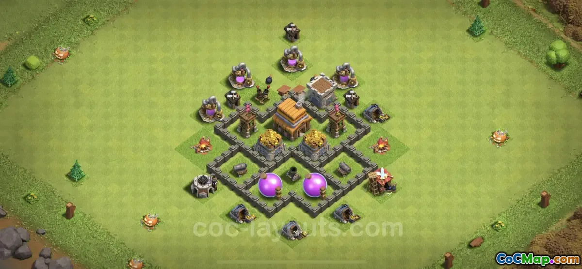 लिंक के साथ TH4 बेस, क्लैश ऑफ क्लैन्स में टाउन हॉल लेवल 4 के खिलाड़ियों के लिए डिज़ाइन की गई एक रणनीति है, जो बिल्डिंग और रणनीति पर केंद्रित एक बेहद लोकप्रिय मोबाइल गेम है। जैसे-जैसे खिलाड़ी आगे बढ़ते हैं, वे न केवल अपने समग्र गेमप्ले में सुधार करना चाहते हैं बल्कि ट्राफियां भी हासिल करना चाहते हैं। इस बेस लेआउट का उद्देश्य खिलाड़ियों को प्रभावी ढंग से ट्रॉफियां इकट्ठा करने की अनुमति देते हुए रक्षा को बढ़ाना है। रणनीति सुरक्षा को अनुकूलित करने और विरोधियों के हमलों को रोकने के लिए संरचनाओं को कहां रखा जाए, इसके इर्द-गिर्द घूमती है।
