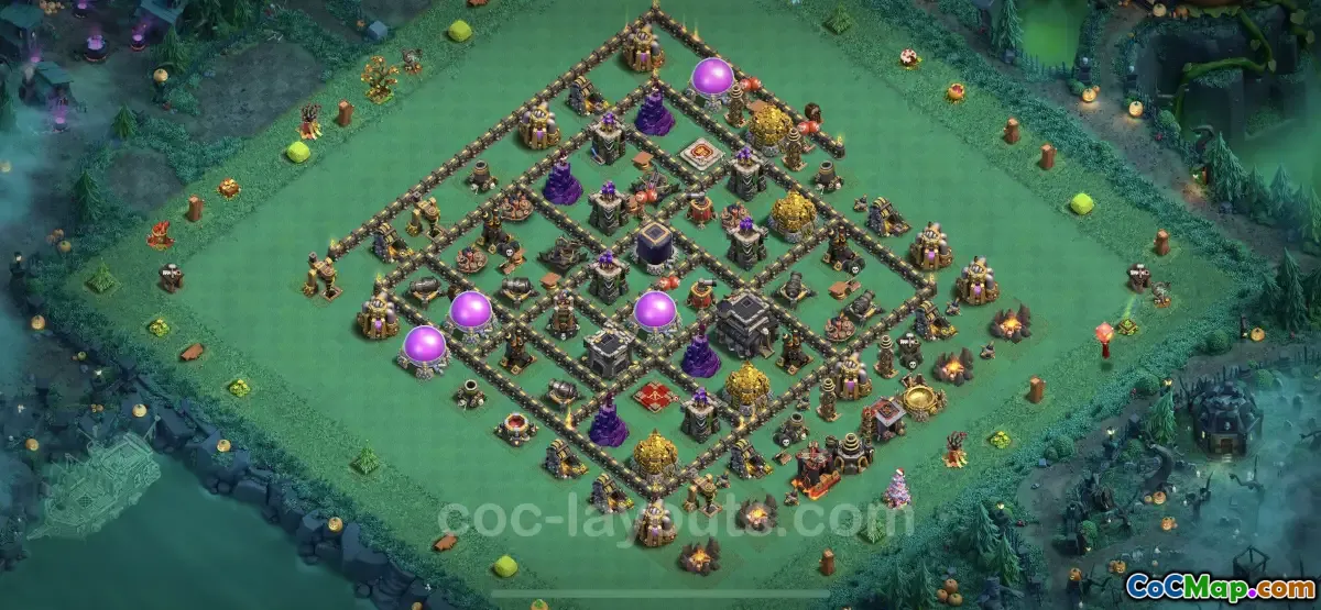 Using a design that incorporates links and buffering defense mechanisms, this TH9 base features traps and defensive buildings arranged to confuse and restrict the movement of enemy troops. The anti-air capabilities are particularly strong, ensuring that dragons and other air units have a difficult time reaching crucial areas of the base. This design is perfect for players who want to safeguard their trophies and resources while minimizing the risk of defeat from air strikes.