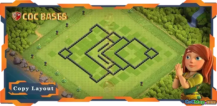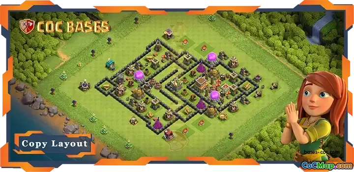 यह टाउन हॉल 8 (टीएच8) बेस विशेष रूप से एक एंटी ट्रॉफी लेआउट के रूप में काम करने के लिए डिज़ाइन किया गया है, जो हवाई हमलों और ड्रैगन रणनीतियों के खिलाफ बचाव पर केंद्रित है। इस रक्षा लेआउट की मुख्य विशेषता सुरक्षा को अधिकतम करने के लिए प्रमुख तत्वों की रणनीतिक स्थिति है। बेस के केंद्र में, टाउन हॉल निचले हिस्से में स्थित है, जो हमलावरों को बेस के बीच में खींचने का काम करता है जहां उन्हें मजबूत सुरक्षा का सामना करना पड़ सकता है।