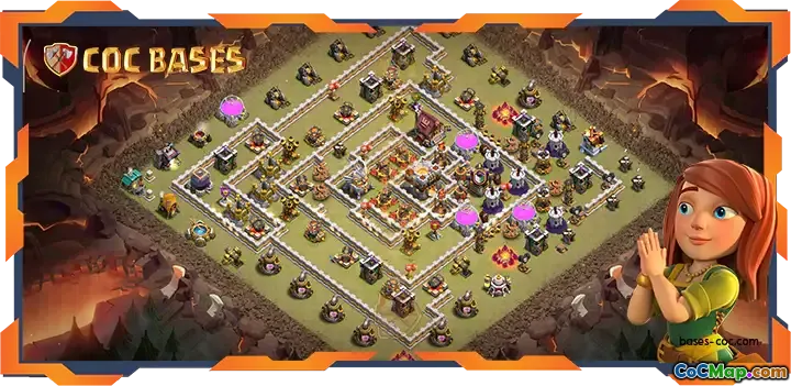 This top-tier TH11 base layout provides strong defense against common attack strategies, including those aimed at achieving 2-star victories. Its carefully positioned walls and compartments create an effective barrier for ground assaults, while strategically placed traps and defenses bolster its resilience.
