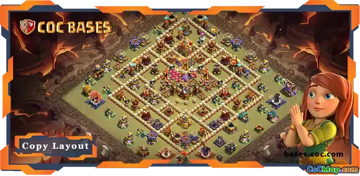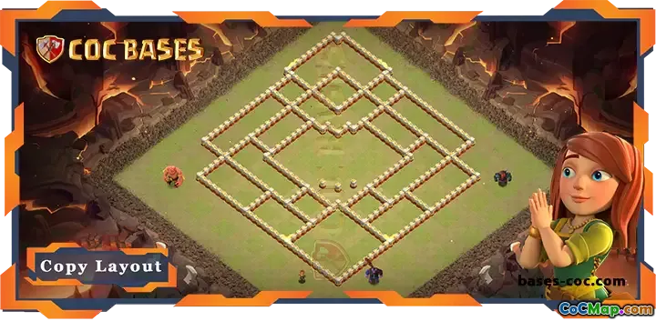 The layout emphasizes centralized key defenses like the Eagle Artillery and Queen, with surrounding walls to slow down enemy troops. The careful placement ofClan Castle and Archer Towers maximizes defensive coverage, making this base highly resilient in clan wars. This anti-3 star design is suitable for players seeking to improve their war performance and safeguard their loot during battles.