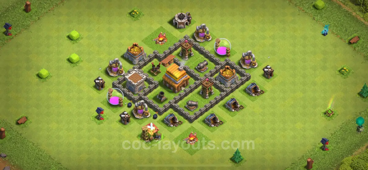 TH4 बेस का एक मुख्य फोकस हमलावरों को तीन स्टार अर्जित करने से रोकना है। यह तीरंदाज़ टावरों, तोपों और दीवारों जैसी रणनीतिक स्थिति वाली सुरक्षा द्वारा हासिल किया जाता है। एक शीर्ष TH4 बेस को एक ऐसा लेआउट बनाना चाहिए जो हमलावरों को सुरक्षा की एक श्रृंखला के माध्यम से नेविगेट करने के लिए मजबूर करता है, जो उन्हें धीमा कर सकता है और उनके आक्रामक हमलों को कमजोर कर सकता है। यह सुनिश्चित करने के लिए कि आधार को भेदना कठिन है, इमारतों और जालों का उचित स्थान महत्वपूर्ण है, जिससे महत्वपूर्ण संसाधनों की सुरक्षा होती है।