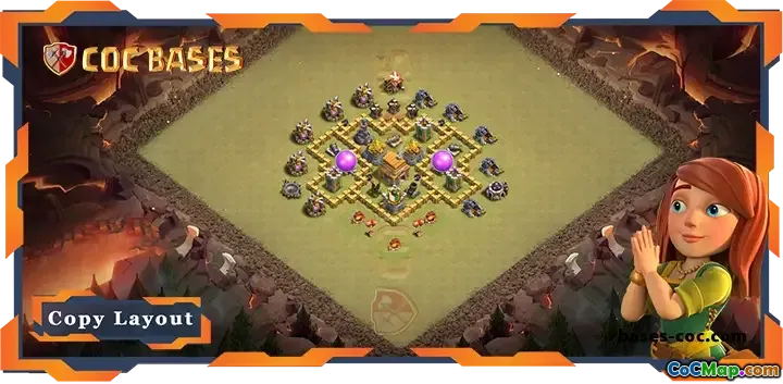 This top TH5 war base layout offers a robust defense, combining strategic placement of walls, Clan Castle, and defenses to resist enemy attacks effectively. Its hybrid design balances between protecting resources and ensuring a strong central core to withstand bigger raids, making it ideal for clan wars.