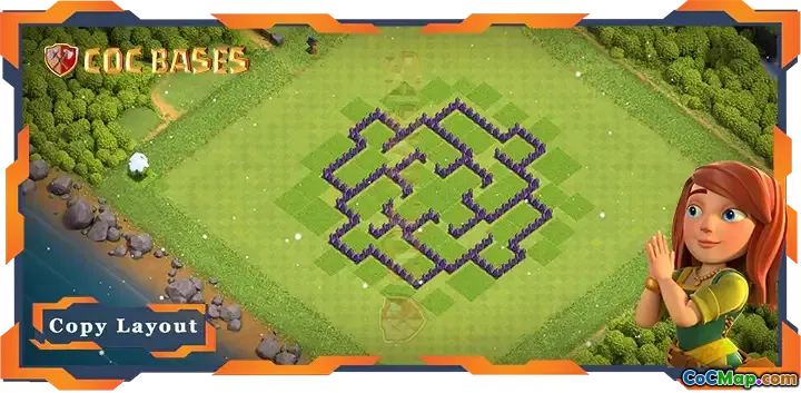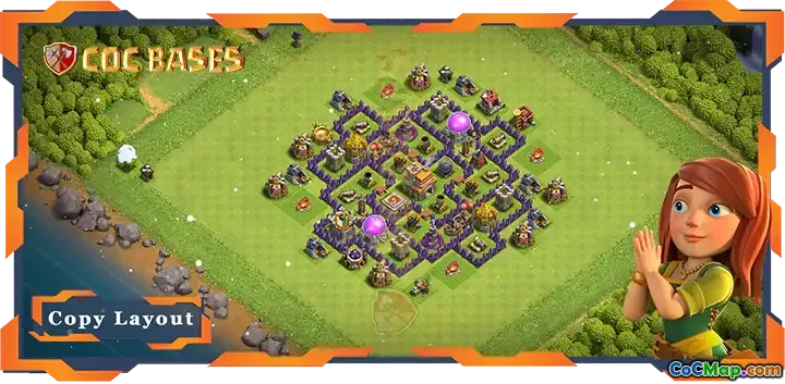 This top TH7 farming base layout is engineered to provide robust protection against all attack strategies. Its carefully positioned defenses and walls create a nearly impenetrable shield around resources, making it ideal for farming. The hybrid design ensures a balanced approach to resource storage and defensive structures, giving you both safety and efficiency during farming rounds.