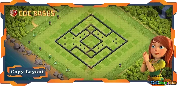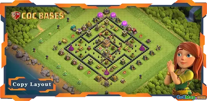 यह टाउन हॉल 8 लेआउट विशेष रूप से हवाई हमलों से बचाव के लिए डिज़ाइन किया गया है, जो इसे ड्रेगन और रणनीतियों के खिलाफ विशेष रूप से प्रभावी बनाता है जिनका उद्देश्य दो सितारों को सुरक्षित करना है। आधार की मुख्य संरचना में टाउन हॉल है, जो रणनीतिक रूप से केंद्र में स्थित है। यह प्लेसमेंट विभिन्न रक्षात्मक संरचनाओं को इसे कई कोणों से कवर करने की अनुमति देकर इसकी सुरक्षा बढ़ाता है।