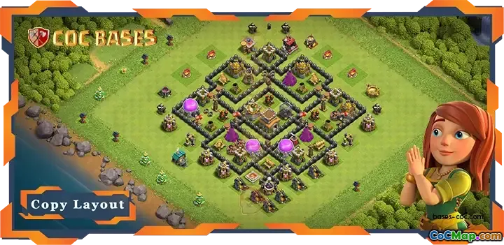 यह TH8 लेआउट रणनीतिक रूप से एक शीर्ष स्तरीय आधार के रूप में डिज़ाइन किया गया है जो एंटी-एवरीथिंग और एंटी-थ्री-स्टार क्षमताएं प्रदान करता है। प्राथमिक ध्यान टाउन हॉल की सुरक्षा पर है, जो आपके बेस की ताकत और सुरक्षा को बनाए रखने के लिए महत्वपूर्ण है। टाउन हॉल को लेआउट के केंद्र में रखने से, हमलावरों के लिए उस तक पहुंचना अधिक चुनौतीपूर्ण हो जाता है, जिससे विभिन्न हमले की रणनीतियों के खिलाफ सफलतापूर्वक बचाव की संभावना बढ़ जाती है।