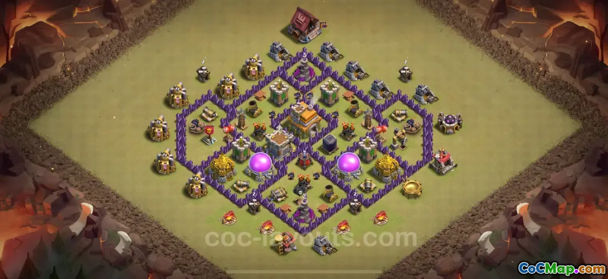Desain pangkalan perang TH7 berfokus pada pembuatan tata letak yang melindungi struktur dan sumber daya pertahanan utama. Pangkalan-pangkalan ini sering kali menggabungkan berbagai prinsip pertahanan seperti kompartementalisasi, penempatan perangkap yang strategis, dan memastikan pertahanan udara dan darat seimbang. Pemain yang mencari pangkalan perang yang efektif akan mendapatkan keuntungan dengan memanfaatkan tata letak rumit yang memaksa penyerang mengambil keputusan sulit, sehingga menyebabkan serangan menjadi kurang efektif.