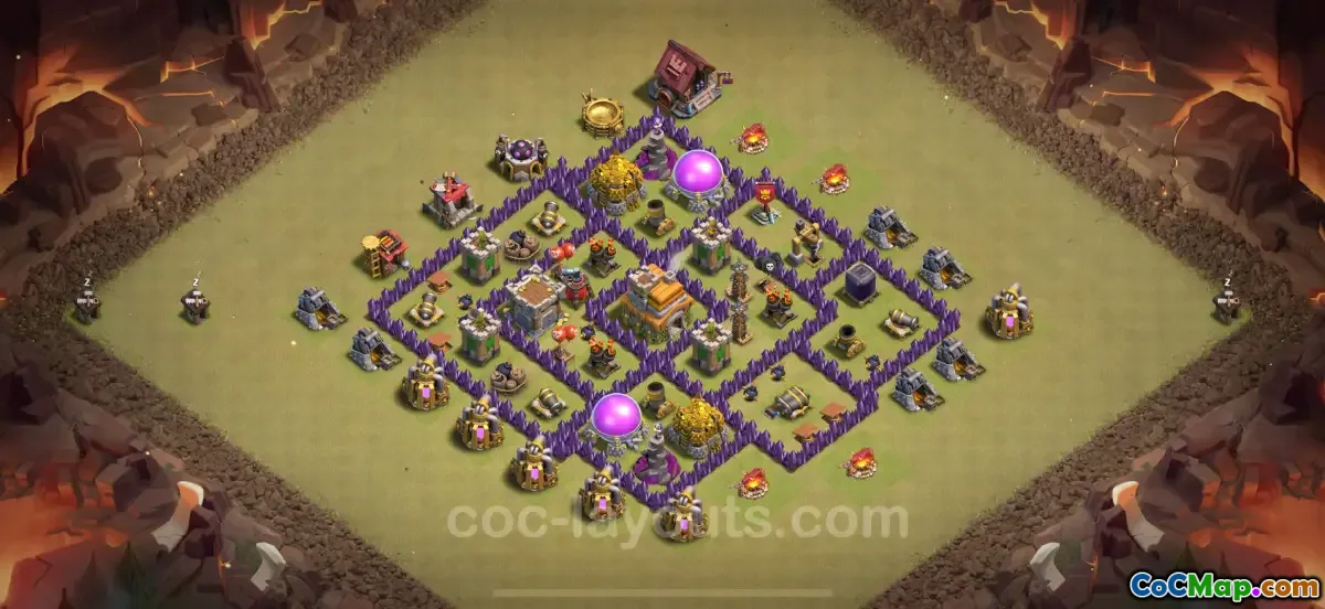 Pangkalan anti perang bintang 3 teratas untuk TH7 dirancang secara strategis untuk mengurangi serangan dari berbagai kombinasi pasukan. Pangkalan ini menggabungkan fitur seperti kompartementalisasi, yang membagi pangkalan menjadi beberapa bagian untuk memperlambat pasukan musuh dan mencegah mereka mencapai Balai Kota dengan mudah. Dengan menciptakan penghalang dan memastikan perlindungan struktur utama, pangkalan ini sangat meningkatkan peluang menahan serangan musuh selama perang klan.