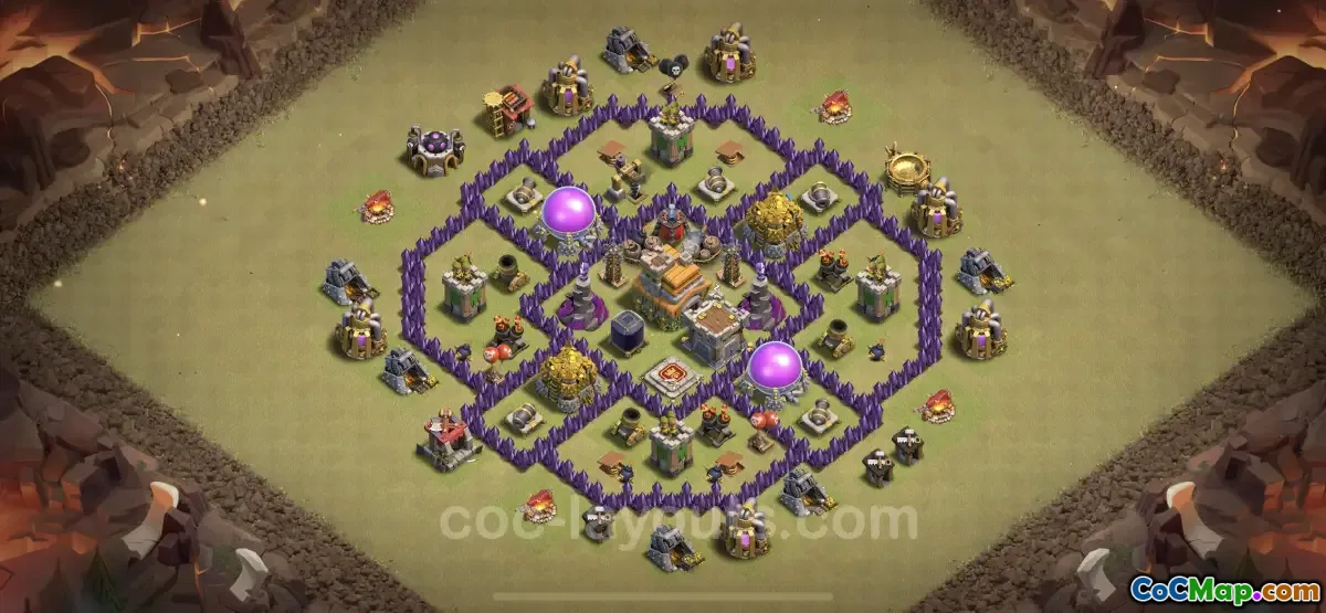 Tata letak dasar TH7 ini menggabungkan elemen pertahanan utama yang ditempatkan secara strategis untuk memaksimalkan efektivitasnya. Tata letaknya dirancang untuk menyebarkan pertahanan seperti Menara Pemanah, Meriam, dan Busur Silang untuk mencakup berbagai sudut serangan. Dengan melakukan hal ini, pangkalan memaksa penyerang untuk membagi pasukannya, sehingga menyulitkan keberhasilan serangan. Penempatan pertahanan ini, dikombinasikan dengan kompartementalisasi bangunan, juga membantu menjebak pasukan musuh dan menunda kemajuan mereka menuju Balai Kota.