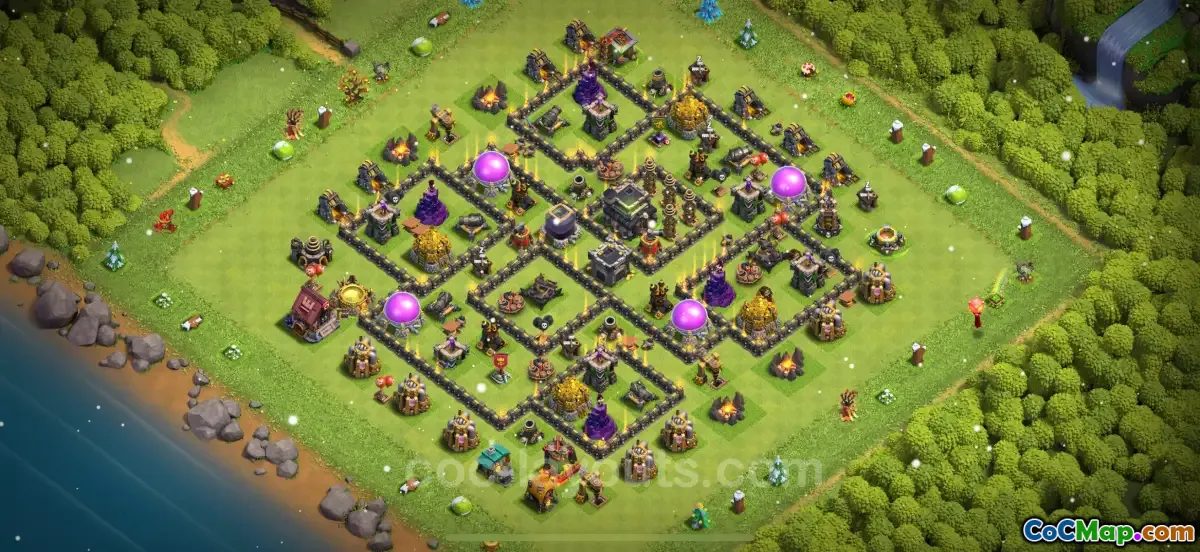 The Town Hall Level 9 (TH9) base design in Clash of Clans for 2024 focuses on creating a hybrid layout that effectively protects resources while also defending against three-star attacks. The TH9 hybrid base aims to offer a balance between farming and trophy defense, making it suitable for players who wish to maintain their resources while still pushing for a higher trophy count.