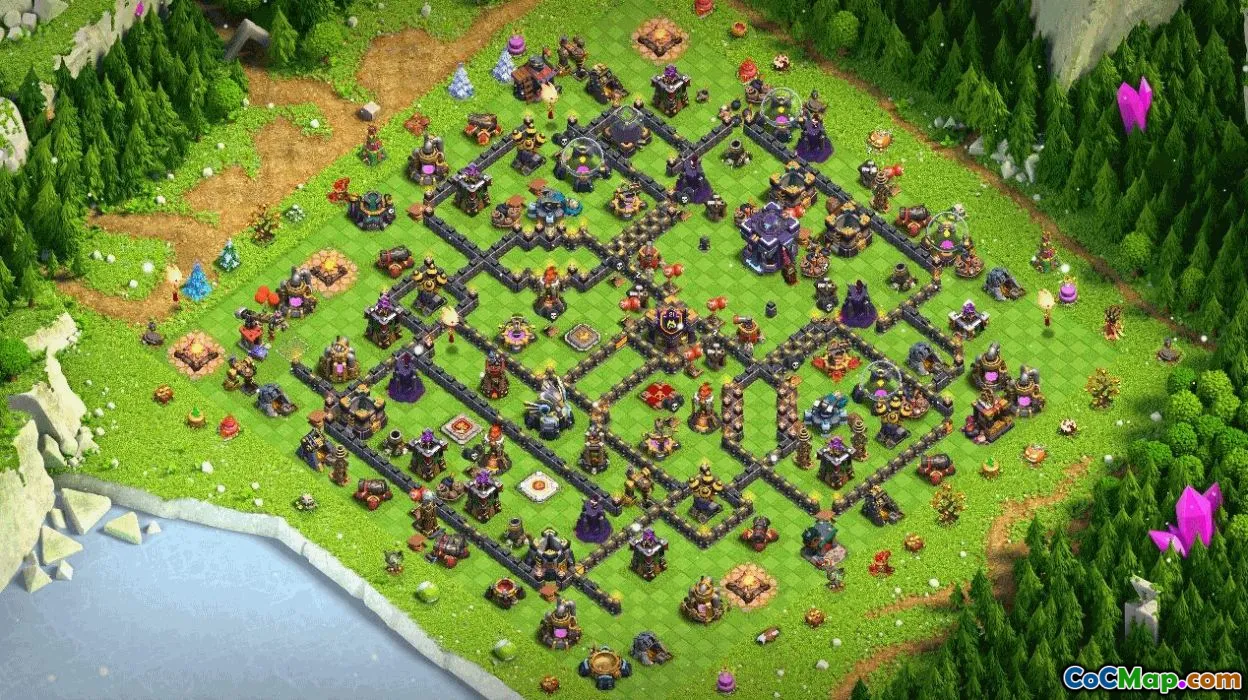 In addition to the main town hall layout, there are dedicated designs for home village setups, trophy ranges, and war bases. The home village layout focuses on resource protection and quick recovery, while the trophy base is optimized to defend against players targeting high-ranked opponents to gain or lose trophies. War bases are tailored specifically for clan wars, emphasizing centralized defenses and trap placements to thwart enemy attacks and secure victories for the clan.