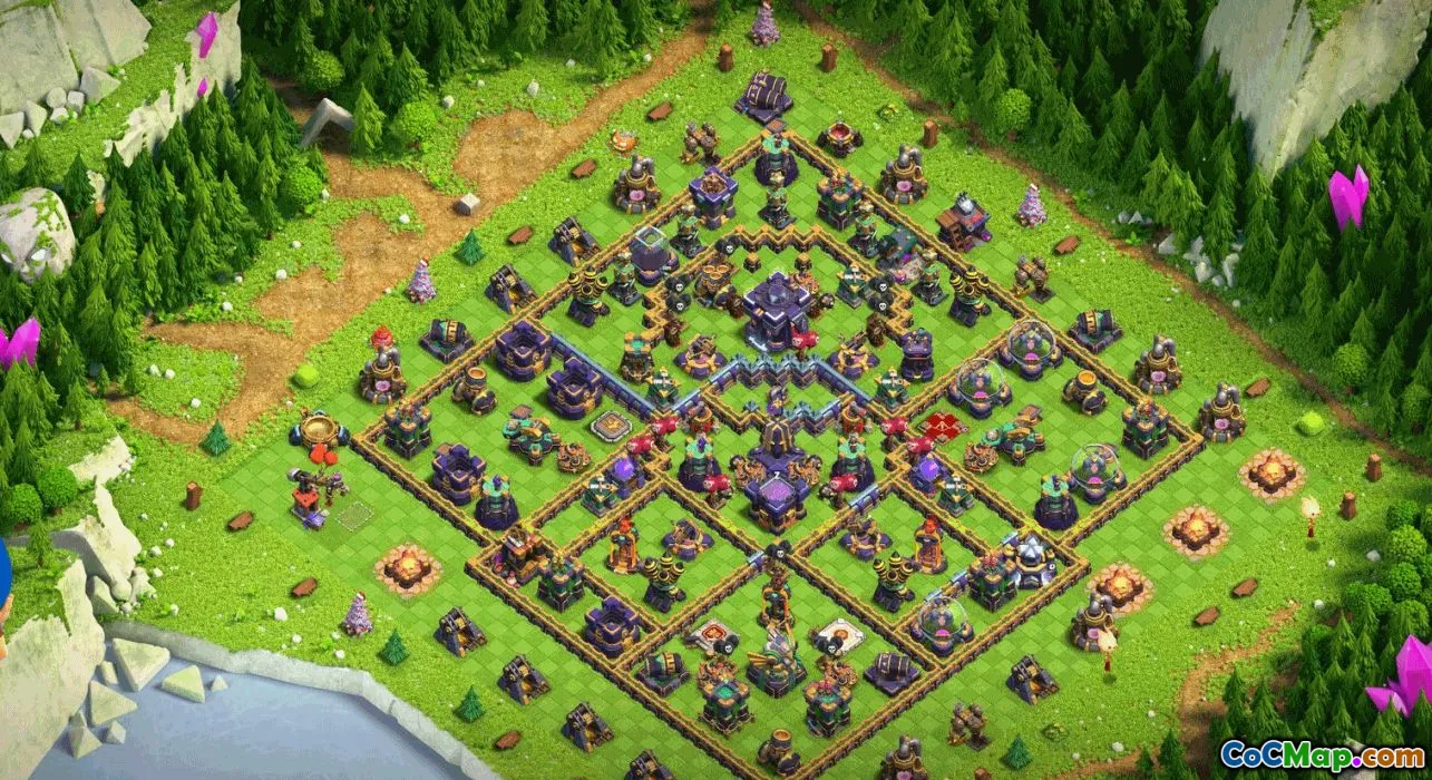 The home village layouts provide a balanced design that ensures good protection of resources and Town Hall while maintaining easy access for troop deployment and farming. Trophy bases are specially designed to help players defend their trophies and prevent enemies from gaining high rankings. War bases focus on defending against attackers during clan wars, often featuring complex setups to mislead opponents and protect vital defensive structures.