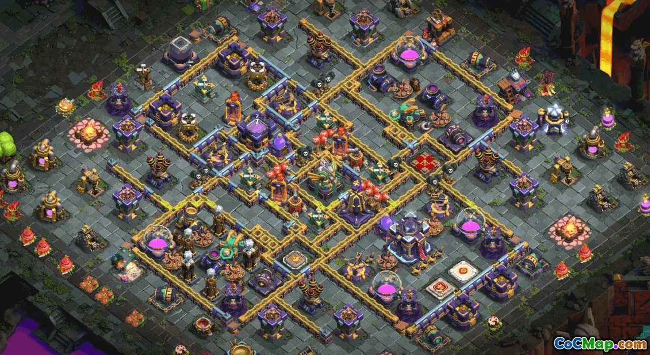 The base layouts are designed to optimize defense and make it difficult for opponents to achieve high destruction rates. For the home village, the designs focus on resource protection and ensuring that key structures are well-guarded. Trophy bases are geared towards maintaining or increasing a player's ranking by discouraging attacks from highly experienced opponents. War bases are carefully crafted to protect the clan's war assets and prevent opponents from easy victories during battles.