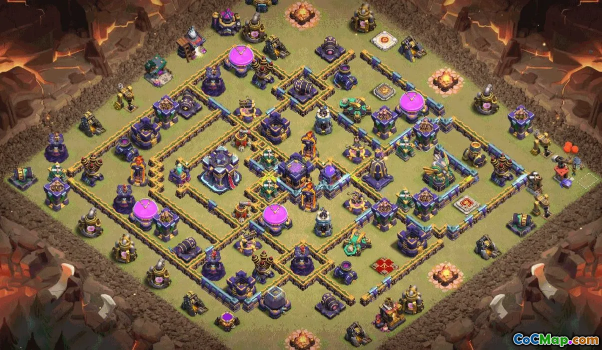 In addition to the home village layouts, specific war bases are available that are designed to maximize defensive capabilities during clan wars. These war bases typically feature well-placed traps, walls, and defenses to hinder enemy attacks and protect the Town Hall, which is a priority target for opponents. The designs aim to frustrate attacking strategies by decentralizing key defenses and creating multi-layered barriers.