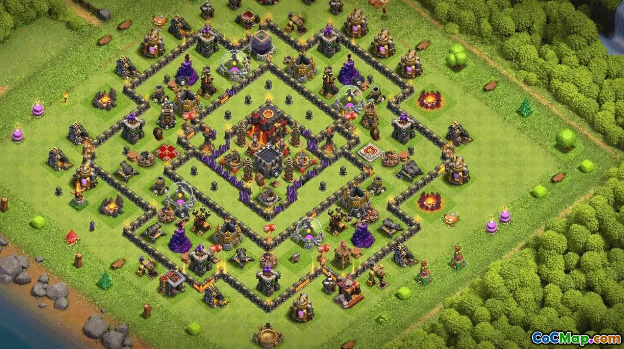 This Town Hall 10 base layout provides a copyable design for home village, trophy base, and war map. The core places the Town Hall at the center, surrounded by multi-layered walls and a balanced mix of defenses to cover both air and ground threats. Outer compartments slow progress and protect storages, while traps and Teslas defend likely breach points. The layout is optimized for a solid anti-3 star performance on CoC maps while remaining versatile for farming and trophy pushing.