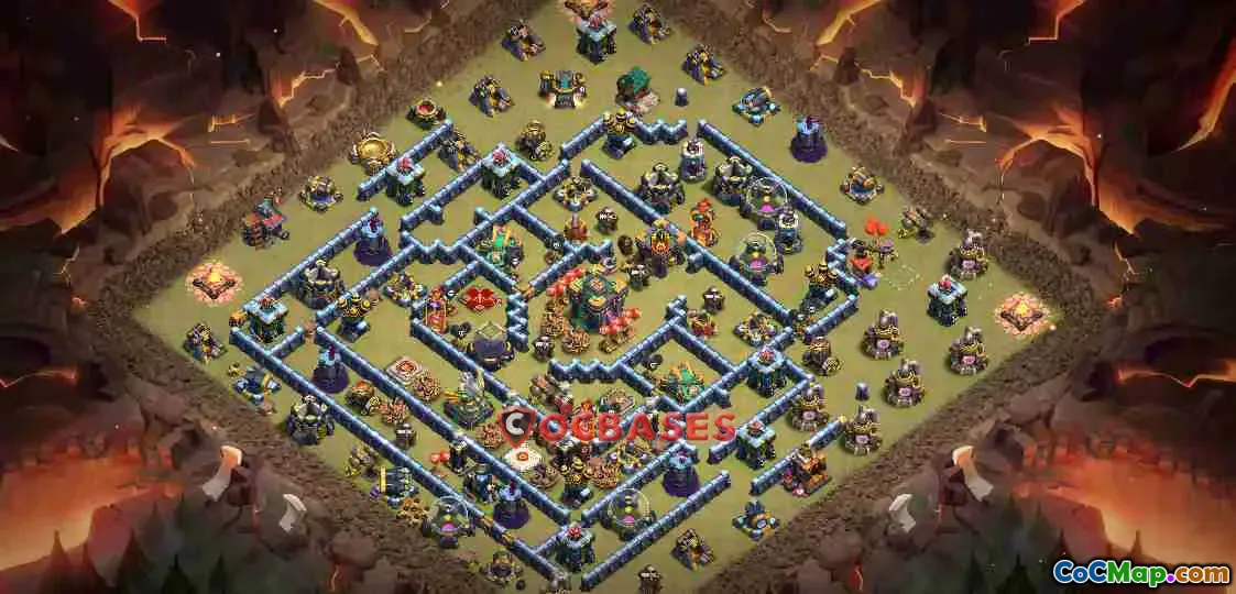 A Town Hall 14 war base designed for Clash of Clans serves the strategic purpose of defending against various attack strategies commonly employed by players. This specific base is built to be effective in Clan War Leagues (CWL) and features an anti two-star layout. By focusing on thwarting opponents' efforts to secure two stars, the base prioritizes design elements that make it difficult for attackers to achieve their objectives, particularly with certain offensive troops and strategies.
