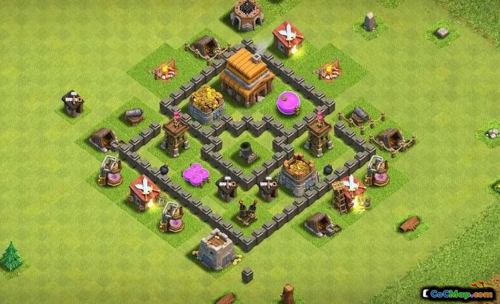 Game Clash of Clans menampilkan berbagai tata letak dasar yang dapat digunakan pemain untuk mengoptimalkan pertahanan mereka dan meningkatkan pengalaman gameplay mereka. Salah satu aspek penting adalah tata letak dasar Balai Kota 4, yang menjadi tersedia bagi para pemain saat mereka maju melalui permainan. Pada tahap ini, pemain dapat mulai merancang desa asal mereka dengan strategi khusus untuk melindungi sumber daya mereka dan mencapai kesuksesan dalam pertempuran.