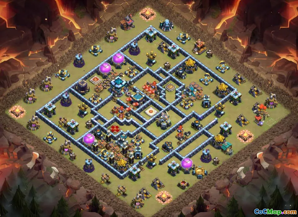Looking for the perfect Town Hall 13 base layout to improve your defenses? This copyable base design offers optimal protection for your resources, trophies, and clan war successes. It features strategic placement of clan castle, air defenses, and traps to counter common attack strategies, making it an ideal choice for both home village and war base setups.