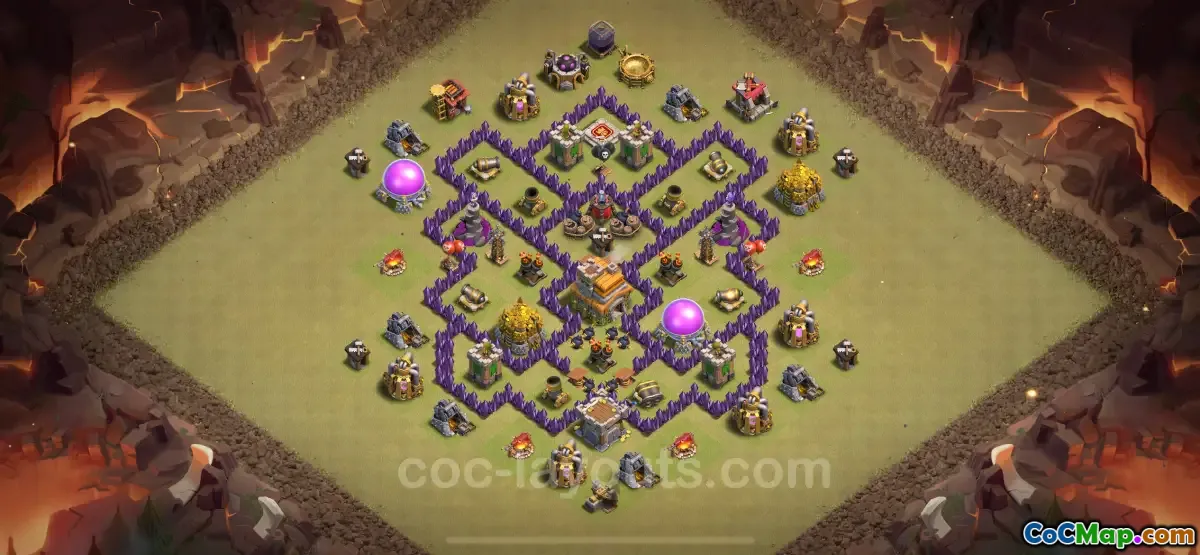Pangkalan yang disarankan menampilkan desain tata letak yang secara khusus dioptimalkan untuk level TH7, menggabungkan penempatan strategis untuk pertahanan, Balai Kota, dan bangunan sumber daya utama. Tujuannya adalah untuk menciptakan struktur yang sulit ditembus, memanfaatkan bangunan pertahanan seperti meriam, menara pemanah, dan menara penyihir secara efektif. Dengan menganalisis pola serangan umum, pangkalan ini dirancang untuk meminimalkan risiko kehilangan bintang selama perang klan dengan memaksa penyerang ke posisi sulit.