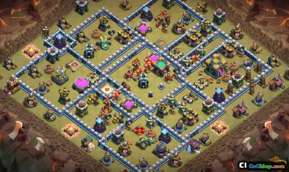 Game Clash of Clans menawarkan kepada pemain berbagai tata letak dasar untuk mengoptimalkan strategi mereka untuk tujuan yang berbeda. Di Balai Kota 14, pemain memiliki akses ke berbagai struktur dan pertahanan yang dapat diatur untuk membuat desa rumah tangga yang efektif, pangkalan perang, dan pangkalan pertanian. Setiap tata letak dirancang dengan tujuan tertentu, apakah itu untuk melindungi sumber daya atau untuk memaksimalkan kemampuan defensif terhadap serangan musuh. Membangun basis yang kuat sangat penting untuk kesuksesan ofensif dan defensif dalam permainan.