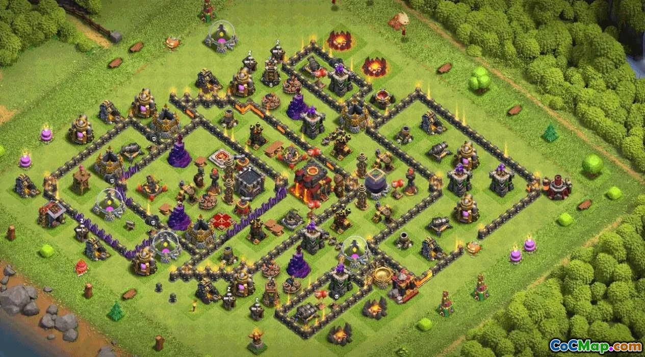 This Town Hall 10 base is crafted as a copyable map for home village, trophy bases, and war layouts. The core places the Town Hall at the center, guarded by X-Bows and Inferno Towers, with storages nearby to create loot protection and draw attackers into traps. Layered walls, well-timed Bomb and Spring Traps, and a central Clan Castle help channel enemy paths while maximizing defensive uptime. The design balances air and ground defenses to counter common TH10 armies.