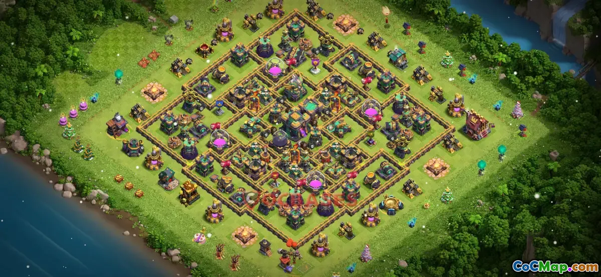 The Town Hall 14 farming base in Clash of Clans is designed primarily to protect resources while allowing players to gather and store valuable loot effectively. This base layout strategically places storages for gold, elixir, and dark elixir in protected locations, often surrounded by defensive structures such as cannons, archer towers, and splash damage defenses. The main goal is to prevent attackers from easily plundering resources, making it ideal for players who focus on farming to upgrade their buildings and troops.