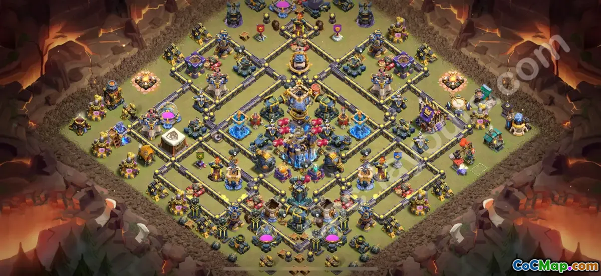 This advanced Town Hall 18 war base layout is designed specifically to prevent opponents from achieving 2-star victories. Its strategic placement of defenses, including key air and ground units, ensures maximum protection of the core and vital resources. The carefully crafted walls and traps create a maze-like structure that confuses and delays attacking troops, reducing your chances of giving up easy stars.